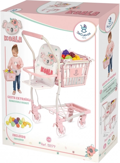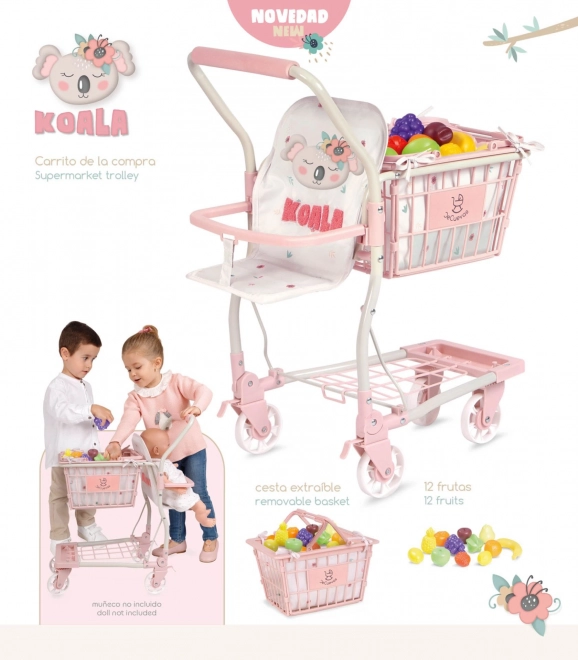 Очарователната детска пазарска количка 2 в 1 от колекция KOALA комбинира голяма подвижна количка с седалка за кукла и подвижна ръчна кошница. Предлага 12 броя пластмасови плодове, въртящи се предни колела, задни спирачки и място за съхранение в долната част. Лесното управление, качествената изработка и нежният дизайн ще зарадват всяка малка продавачка.