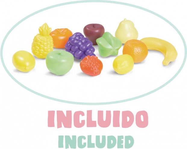 Комплектът включва 12 цветни пластмасови плода, които подпомагат опознаването на храните и развиват фантазията при игра на магазин.