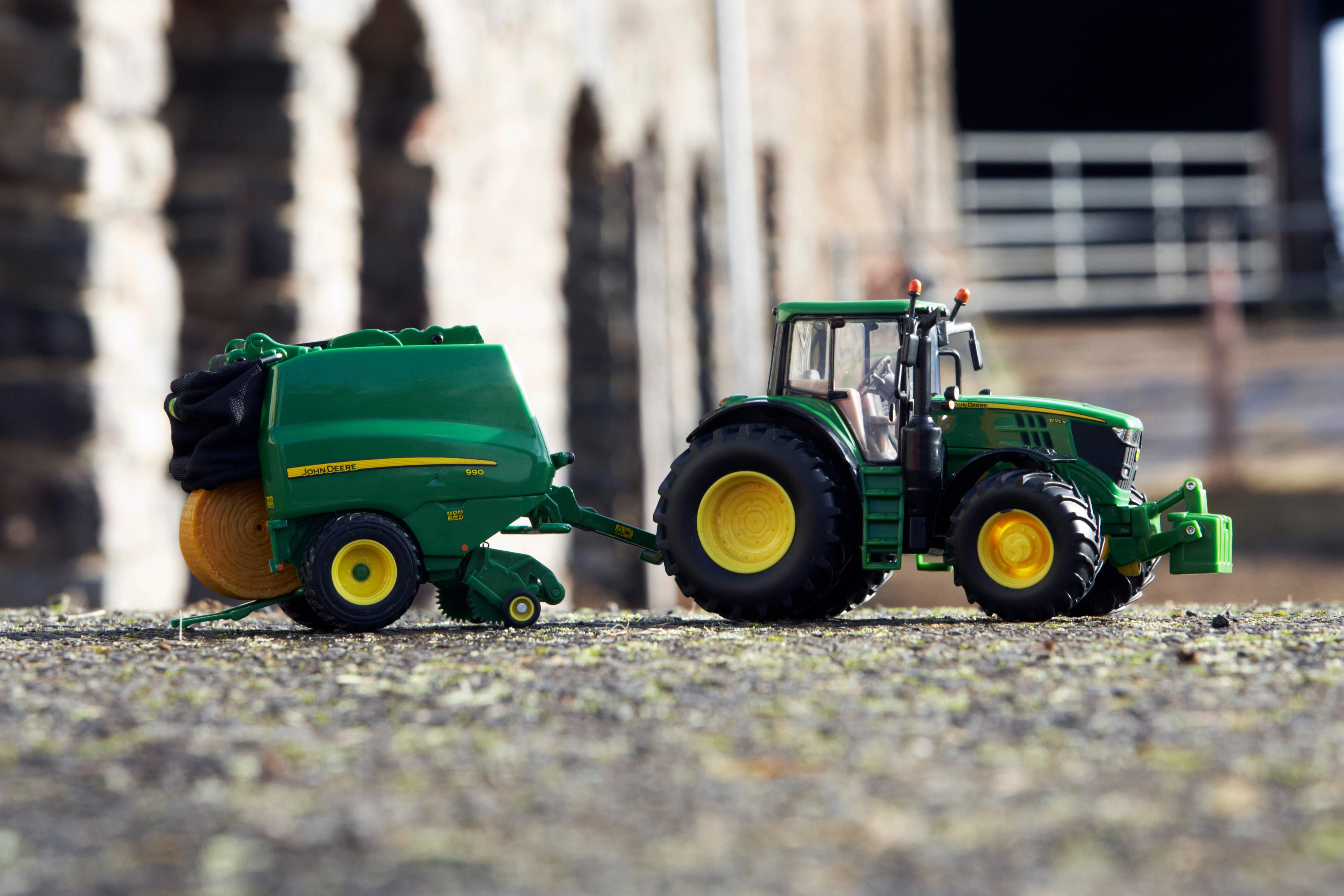 Детайлно изработен модел трактор JOHN DEERE 6195M в мащаб 1:32, който ще зарадва малки и големи почитатели на селскостопанската техника. Метална изработка с пластмасови детайли, дължина 19 cm и свободно въртящи се колела за лесна игра и изложение.