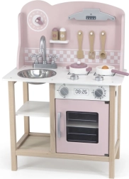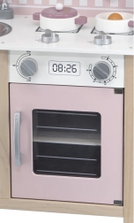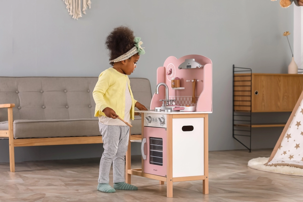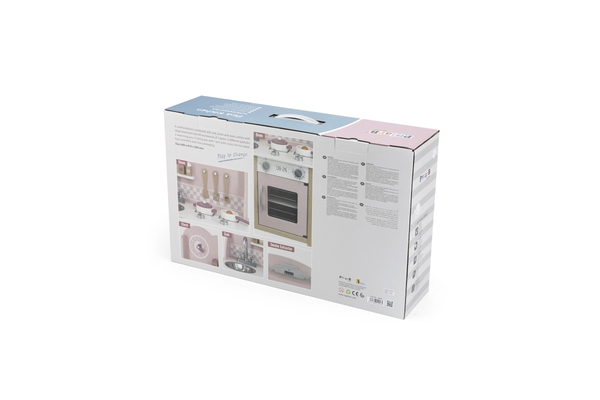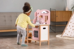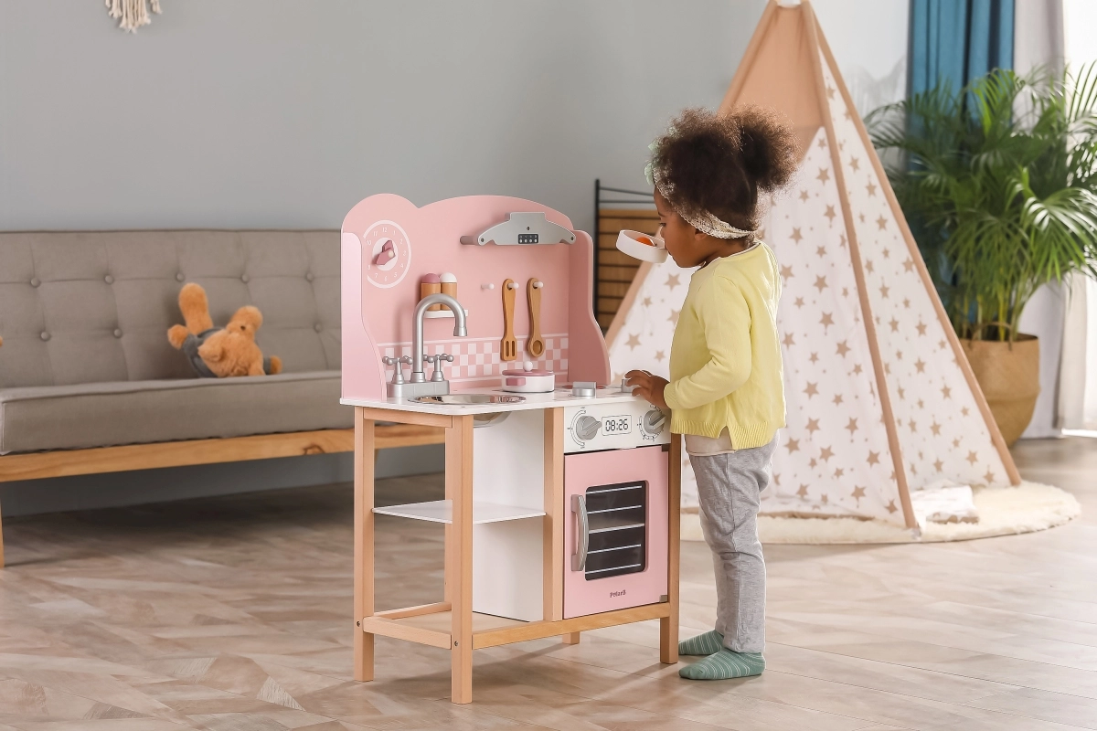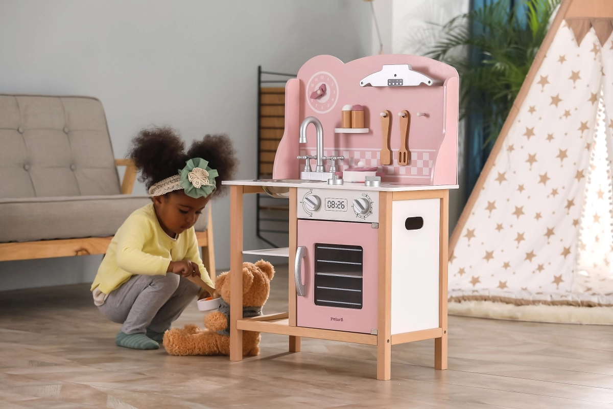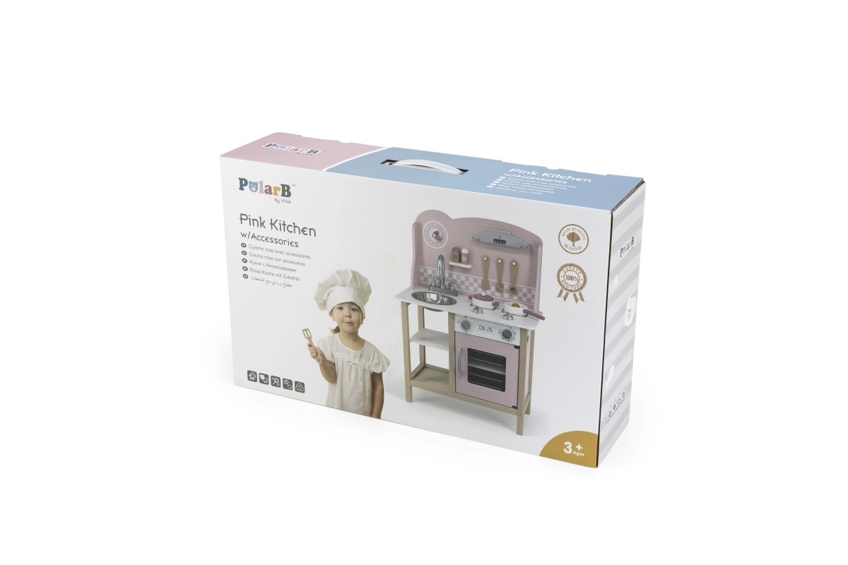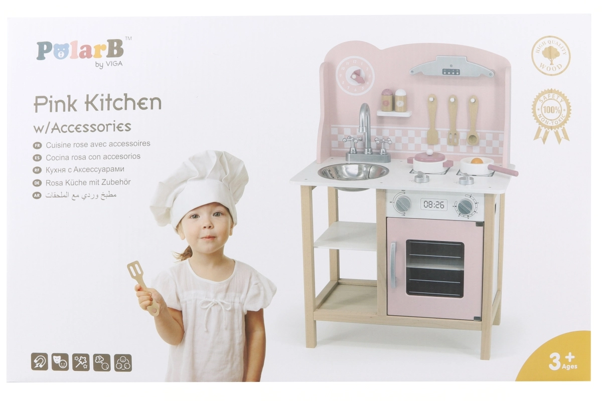 Детската кухничка VIGA PolarB в нежна розово‑бяла комбинация насърчава креативната игра, самостоятелността и социалните умения. Благодарение на реалистичните елементи – от мивка с кран през фурна с вратички до въртящи се копчета с характерно „щракване“ – децата ще изпитат какво е да готвят, пекат и подреждат като възрастни. Дървената конструкция с гладки ръбове и повърхност, обработена с безопасни, нетоксични бои, осигурява дълъг живот и безопасност при игра.