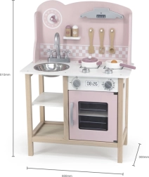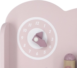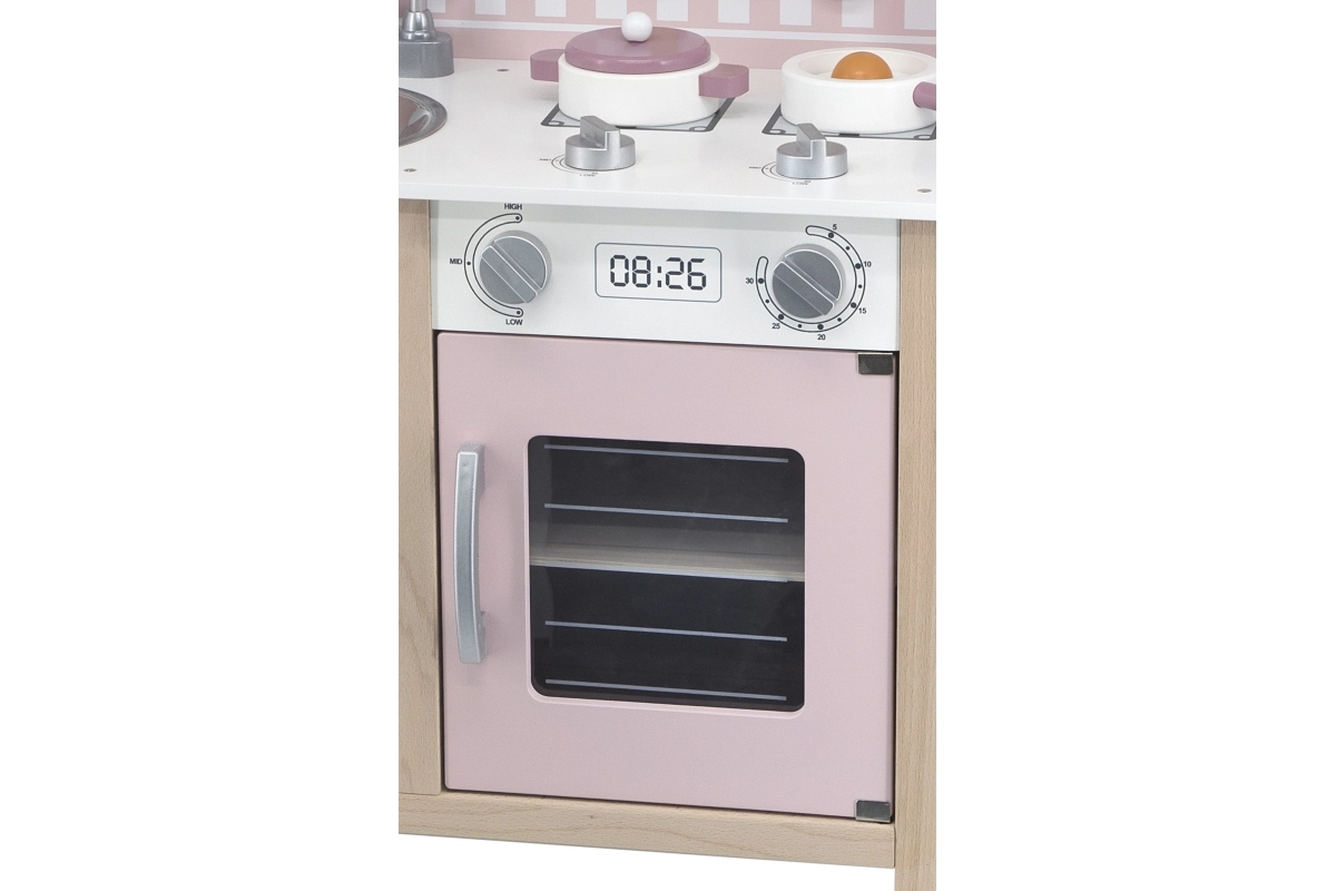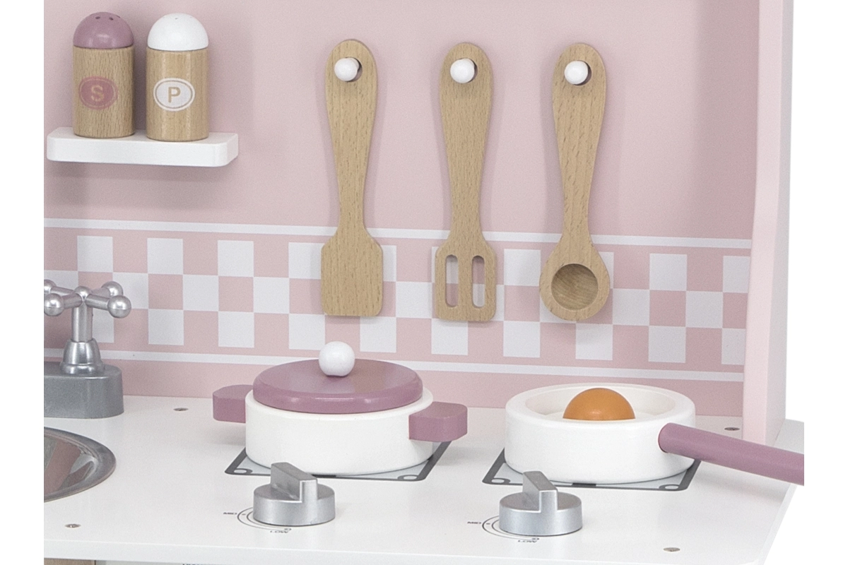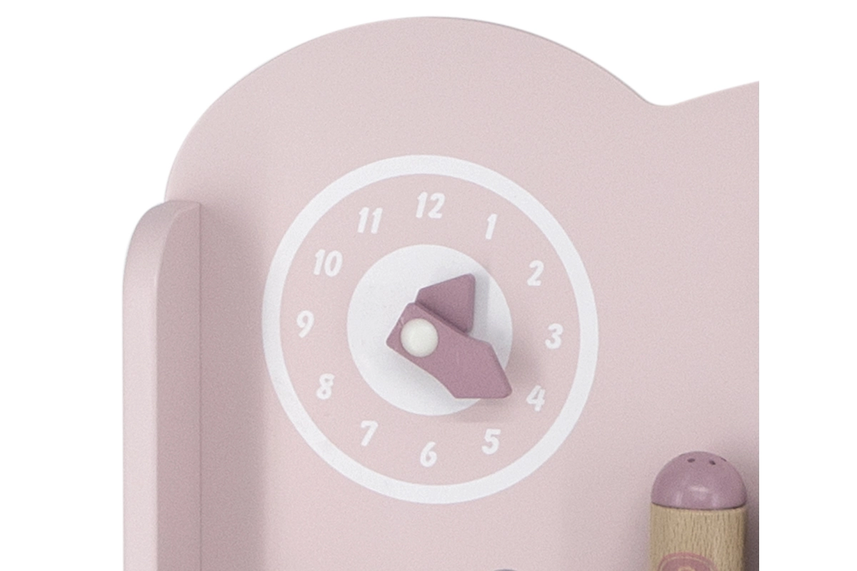 Налични са и практичен съхранителен простор с полица, закачалки за прибори и часовник за забавно учене на време. Богатият комплект аксесоари – тенджера с капак, тиган със запържено яйце, лъжица, решетъчна шпатула, шпатула, солница и пиперница – позволява на децата да приготвят „меню“ за цялото семейство.