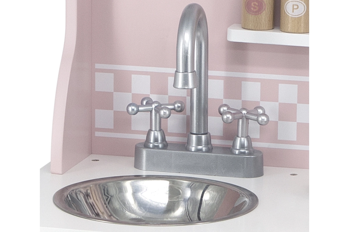 Мивка с кран, фурна с прозрачни вратички, котлони и аспиратор създават автентична среда, която мотивира децата към самостоятелна и изобретателна игра.