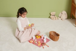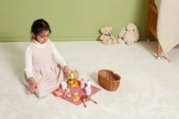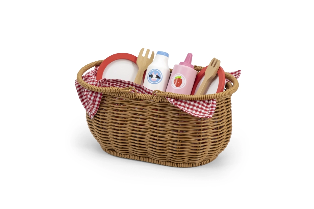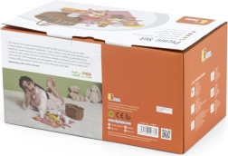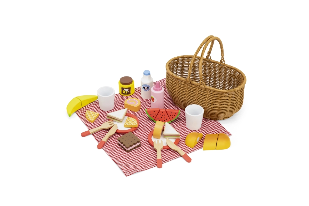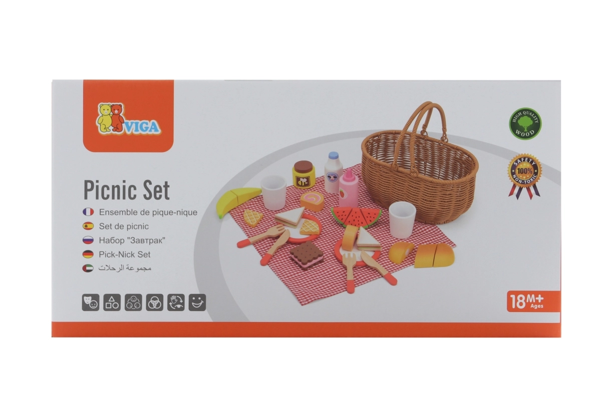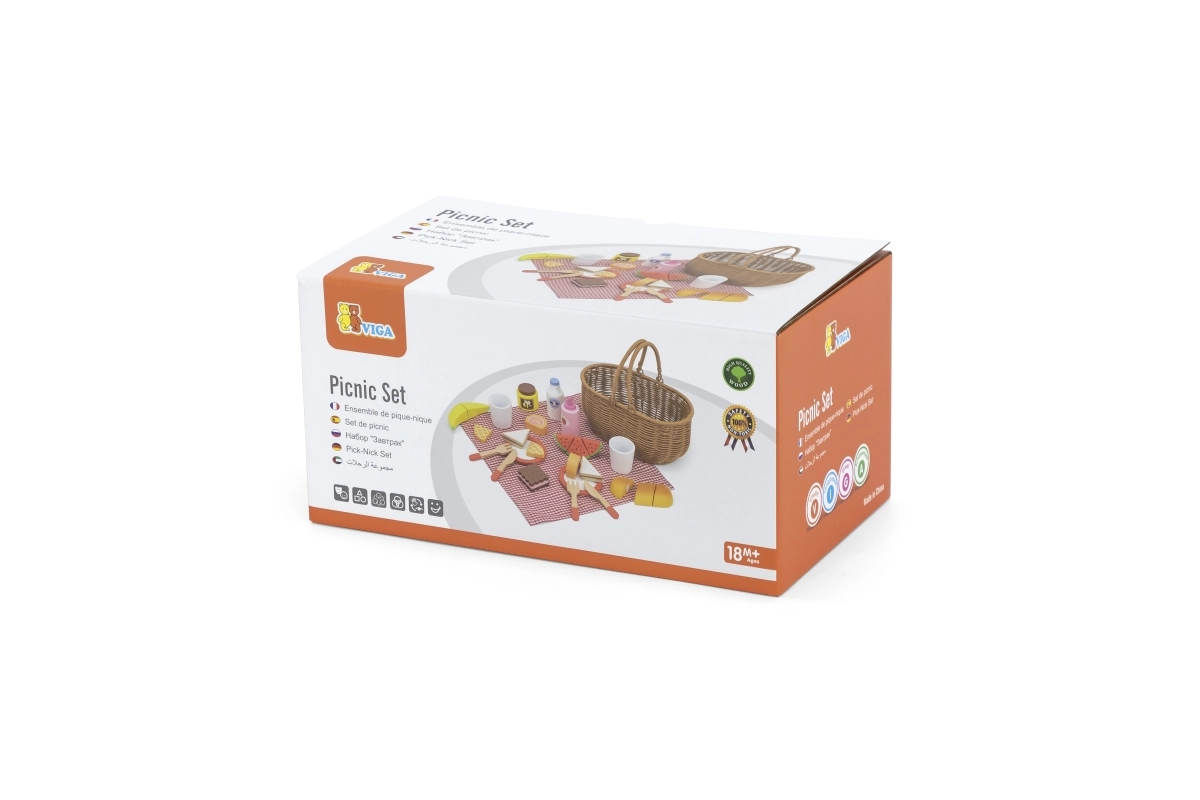 Детският пикник комплект VIGA предлага всичко, което малките готвачи нуждаят за перфектен пикник. Здравата кошница от „плетена“ тръстика е лека за носене, а вътре ще откриете съдове, прибори, напитки и пъстро разнообразие от дървени вкусотии. Част от храните са разделящи се и съединени с велкро, така че децата могат безопасно да пробват рязане и сервиране.