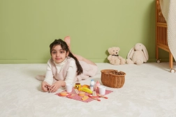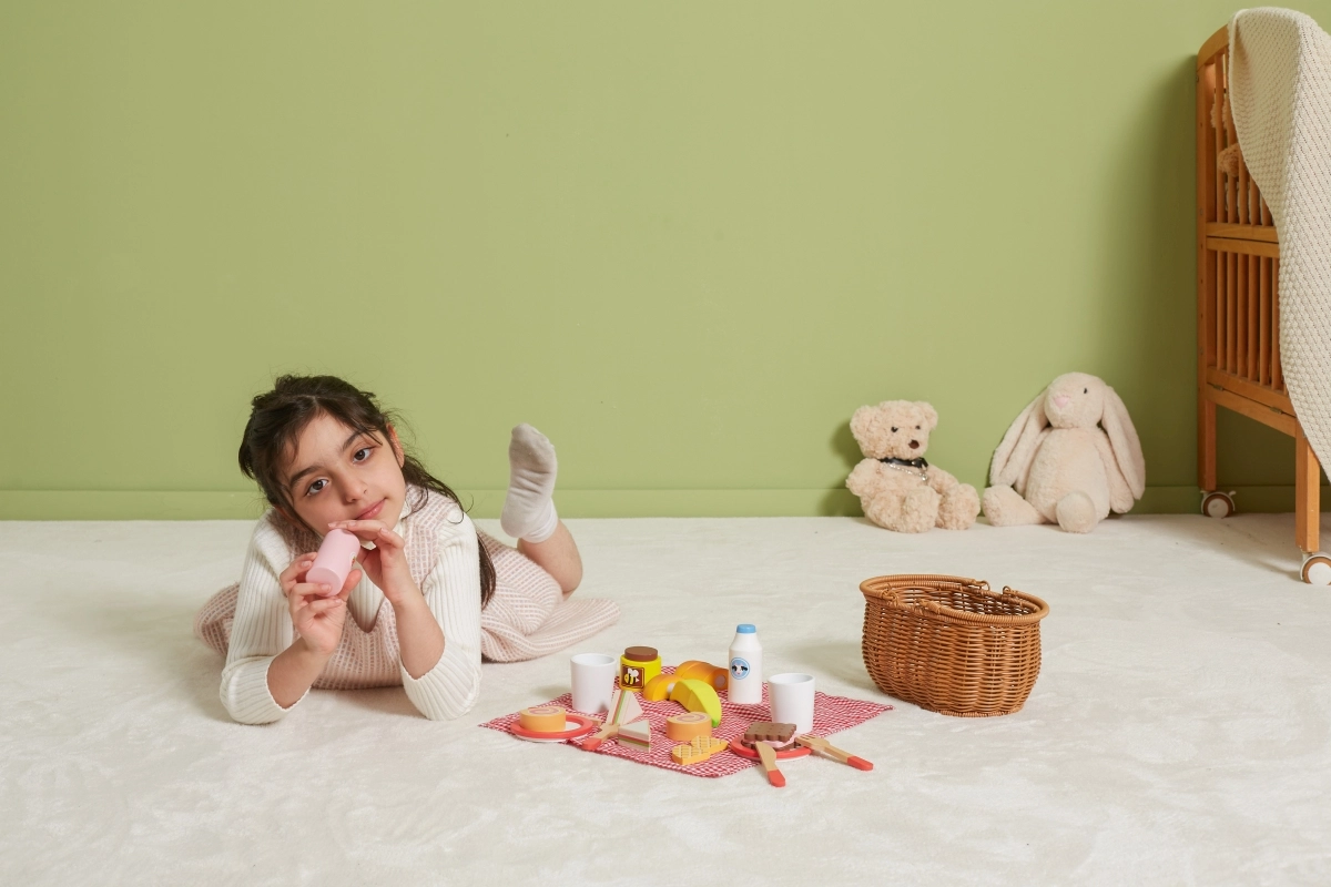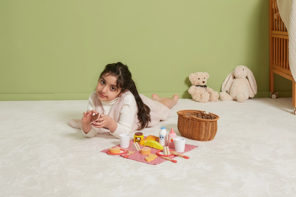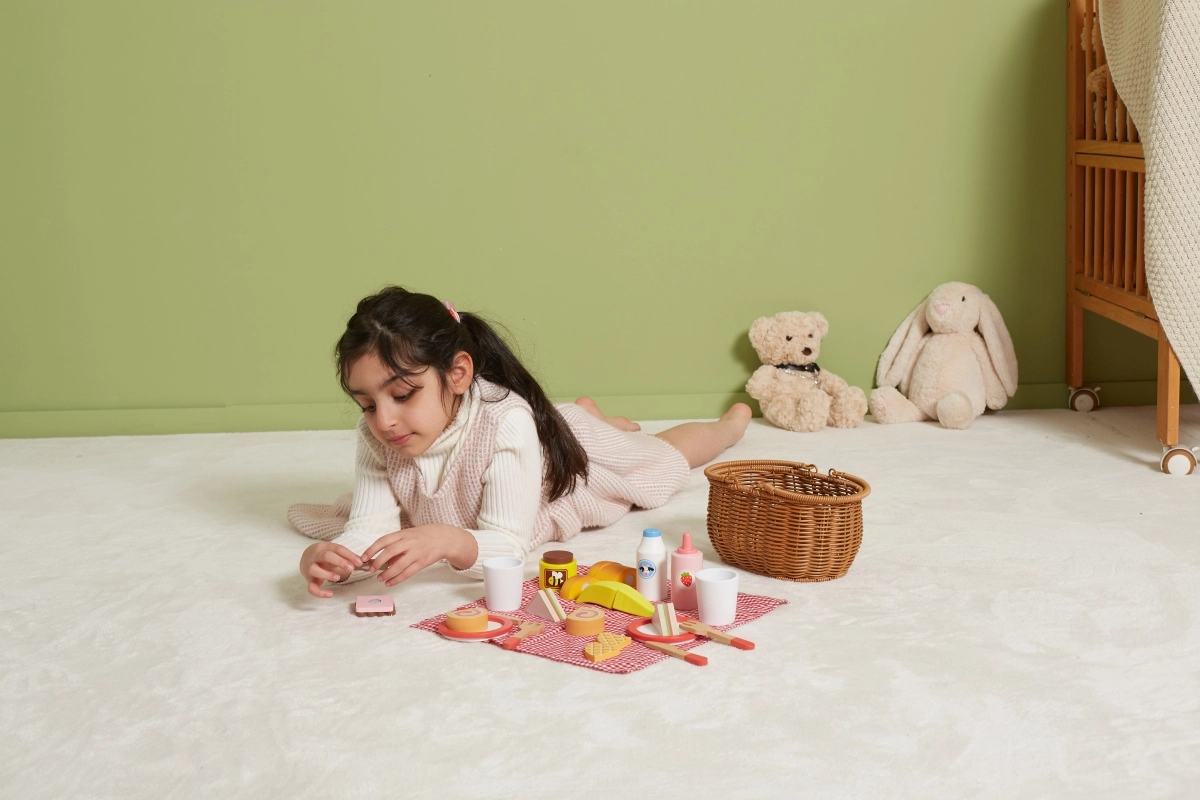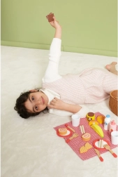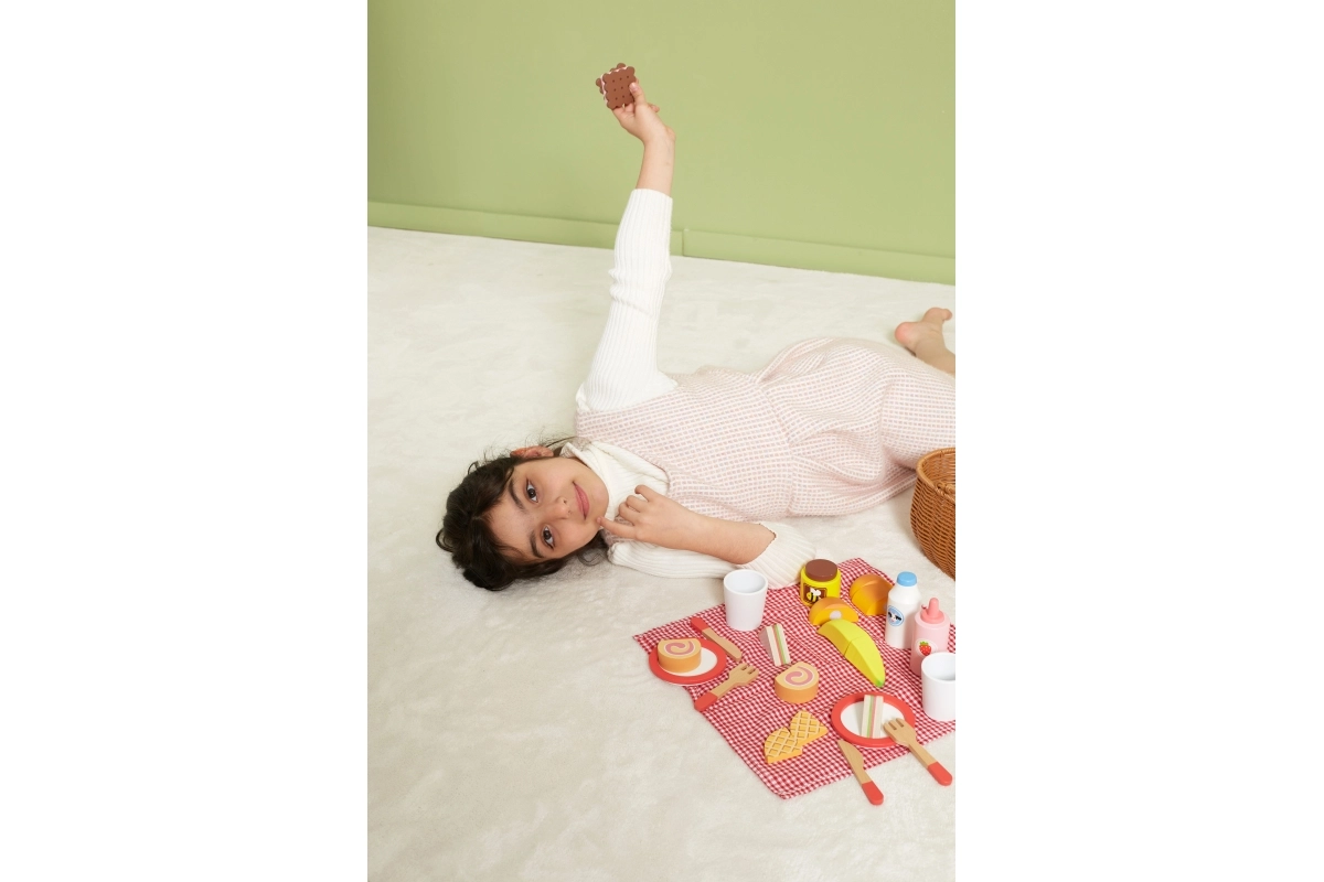 Всичко, от което децата се нуждаят: чинийки, чашки, прибори, печива, плодове и „напитки“ – идеално за игра на угощение и сервиране.