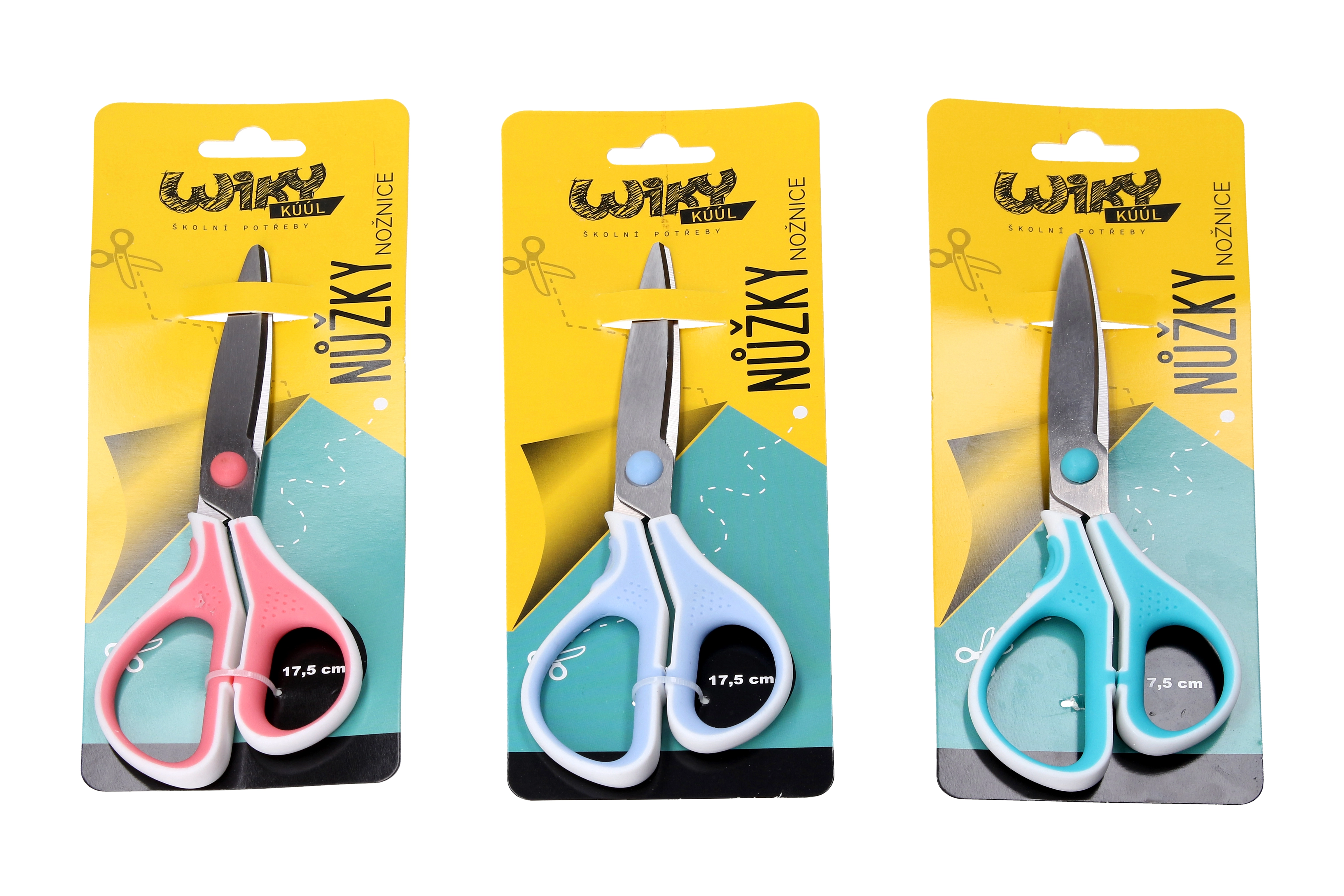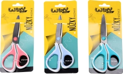 Практични цветни ножици с дължина 17,5 см с ергономично оформена мека дръжка и гумен противохлъзгащ се захват. Подходящи за училище, домакинство и офис. Предлагат се в 3 цветови варианта.