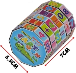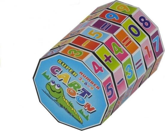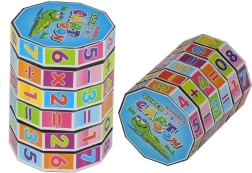 Пъстър цилиндричен пъзел с въртящи се пръстени помага на децата играйки да усвоят основите на математиката. Благодарение на числата и знаците децата упражняват събиране, изваждане, умножение и деление по всяко време и навсякъде. Здравата изработка от безопасни материали отговаря на стандарта EN 71, подходящ е от 3 години, а компактните размери 7 × 5,5 cm го правят идеален спътник при пътуване.