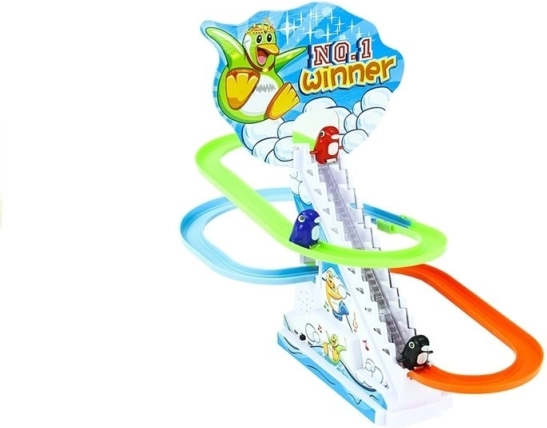 Този игрален сет с подвижни стълби предлага интерактивна игра, при която пингвинчетата се плъзгат по пистите, докато звучи ритмична мелодия. Безопасната играчка е създадена с грижа за най-малките деца, които обичат цветни и живи забавления.