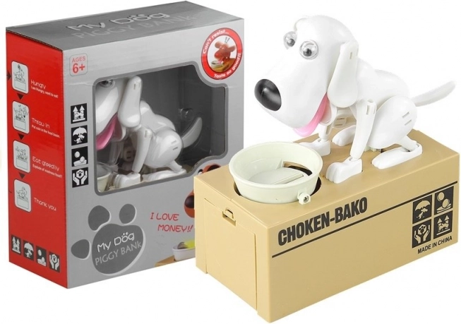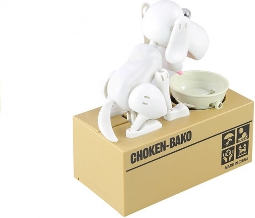 Тази оригинална спестовна касичка съчетава модерен дизайн и функционалност. Голямото сандъче служи като контейнер за монети, а на капака седи енергично бяло кученце с розов език и черно носле. Достатъчно е да пуснете монета в купичката и да наблюдавате как кученцето с ентусиазъм я „изяжда“ – така децата по забавен начин усвояват навика да спестяват.