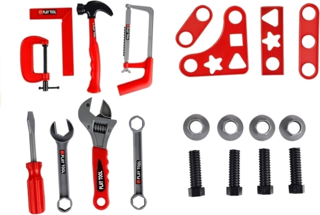 Големият комплект инструменти е предназначен за малки майстори, които искат да имитират домашни поправки като тати или дядо. Тази забавна дейност допринася за развитието на уменията и креативността на децата. Всеки елемент от комплекта е изработен от лека пластмаса, която гарантира лесна употреба.