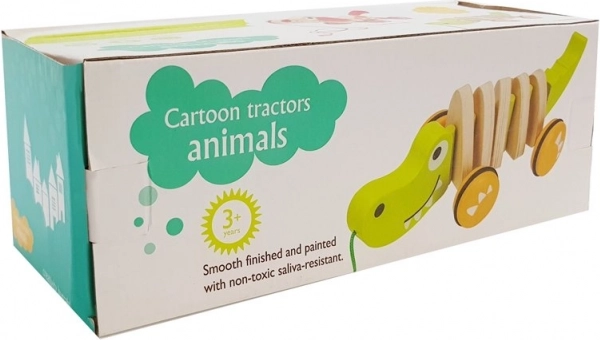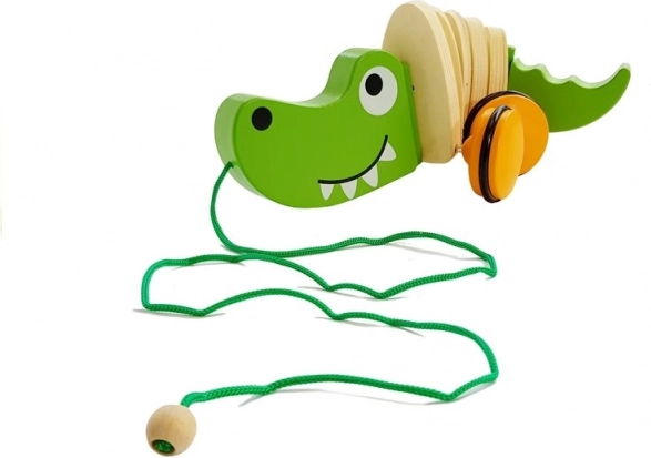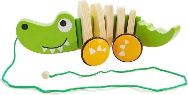 Дървеният крокодил на колелца е класическа дърпана играчка, която подпомага естественото развитие на ходенето, равновесието и фината и грубата моторика. Зеленият крокодил с приятелска усмивка се вълнообразно движи при дърпане, забавлява децата и ги мотивира за още стъпки.