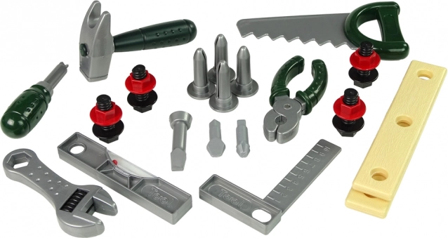 Трион, чук, отвертка, гаечен ключ, комбинирани клещи, винтове, гайки и планки – всичко, което малкият майстор се нуждае, за да тренира фината моторика и въображението.