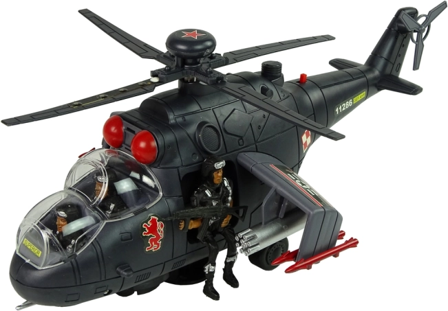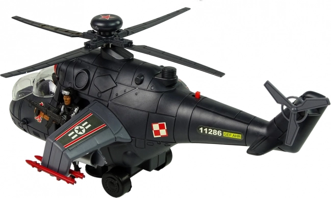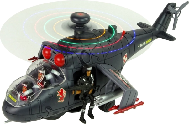 Изработен от здрав пластмасов материал, с огромни въртящи се крила, оборудвани с цветни LED диоди. Вътре в кабината има фигурки на войници – три в комплекта, един от тях с пушка, готов за мисия.