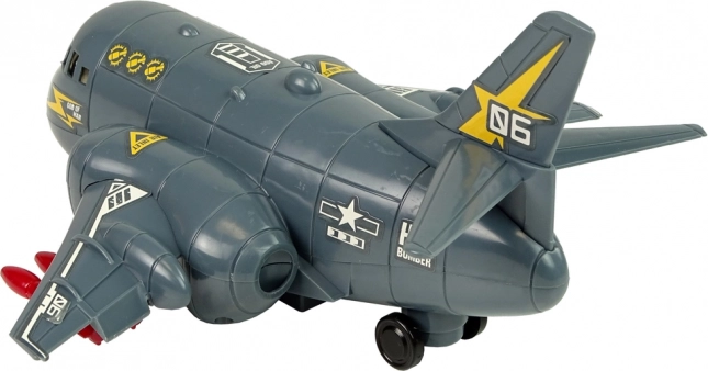 Този интерактивен бомбардировач е идеален за фенове на армията и авиацията. Сивият дизайн с червени ракети придава автентичен военен вид. Играчката е изработена от издръжлива пластмаса и включва цветни диоди, които светят по фюзелажа и крилете, заедно с реалистични звукови ефекти като стартиране и стрелба.