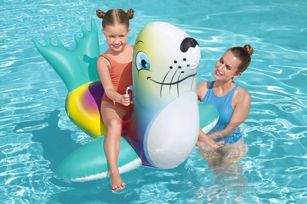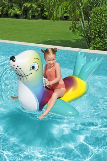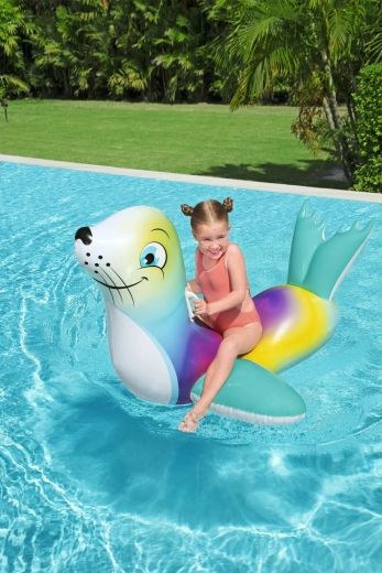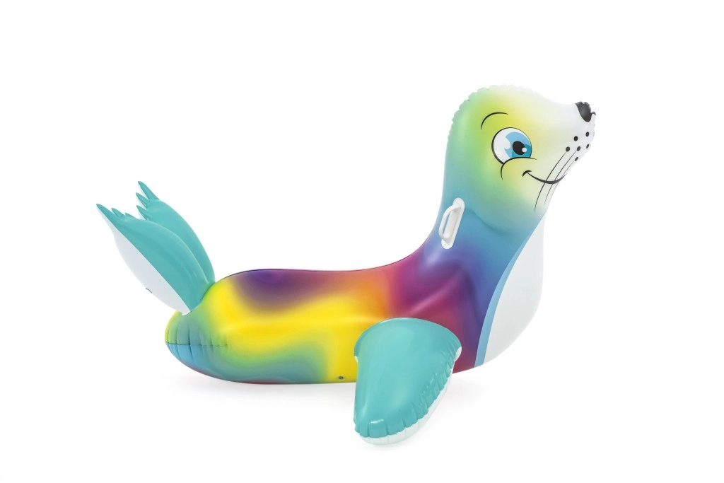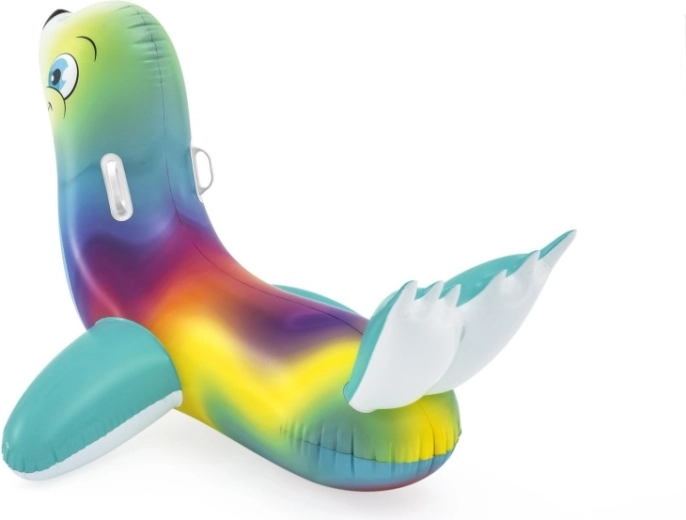 Насладете се на безгрижни летни забавления с цветния надуваем тюлен, идеален за деца от 3 години. Двете практични дръжки осигуряват сигурен захват и по-добър баланс, а гладката, издръжлива повърхност осигурява комфорт при игра и почивка върху водата.