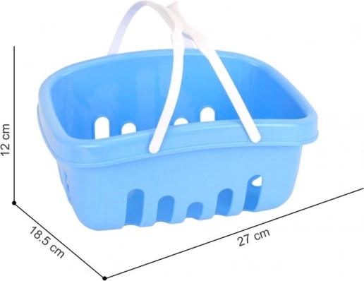 Издръжлива пластмасова кошница с вентилационни отвори и бели дръжки, която децата носят лесно. Компактните размери улесняват съхранението и пренасянето.