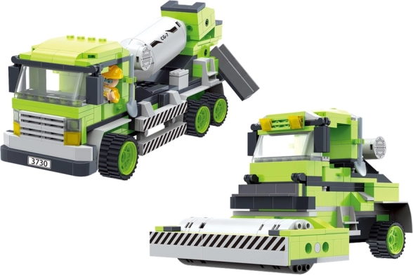 Кубчетата са изработени от издръжлива пластмаса. Радват с голям брой подвижни части и възможности за самостоятелно творчество. Следващият етап е играта, в която от готовите превозни средства създавате свое собствено строителство. Бетоновоз с въртящ се „барабан“, отварящи се врати или превозно средство с въртящ се валяк ще ангажира детето за дълги часове!