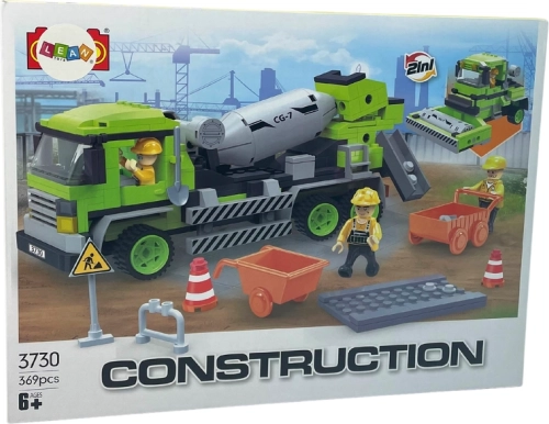 Комплектът съдържа 369 части, изработени от безопасни и сертифицирани материали. Кубчетата са издръжливи и лесни за сглобяване. Благодарение на цветната инструкция можете да сглобите строителните превозни средства стъпка по стъпка и да обогатите своята колекция с нов сет. Опознайте строежа на големи строителни машини и се забавлявайте с мощта им.