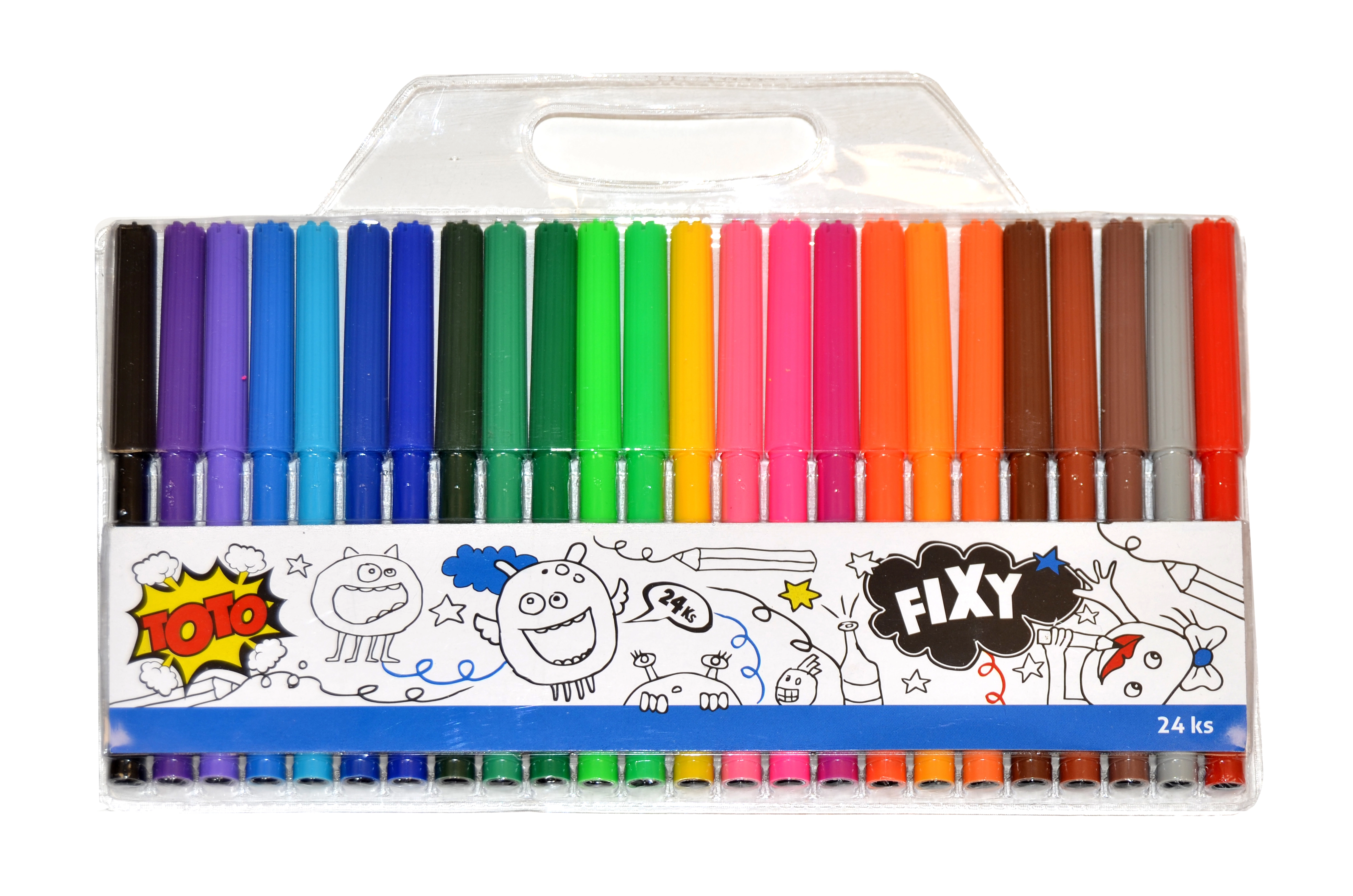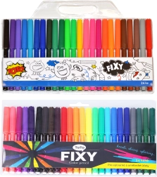 Открийте универсалния комплект от 24 цветни флумастера, който ще зарадва малки и големи творци. Благодарение на влакнестия връх флумастерите се плъзгат удобно по хартията и осигуряват плавна, наситена линия. Идеални са за скициране, оцветяване и писане на заглавия.