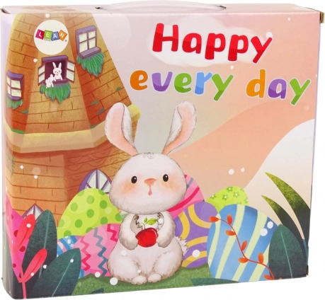 Завъртете великденското настроение с цветен комплект, който съчетава декорация и игра. Дванадесетте пластмасови яйца в различни цветове се отварят и затварят лесно – в шест от тях са скрити малки фиджет играчки, а останалите можете да оставите празни или да напълните със свои изненади. Включена е и очарователна чантичка – зайче, идеална като моден аксесоар или тайно скривалище за дреболии.
