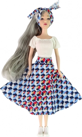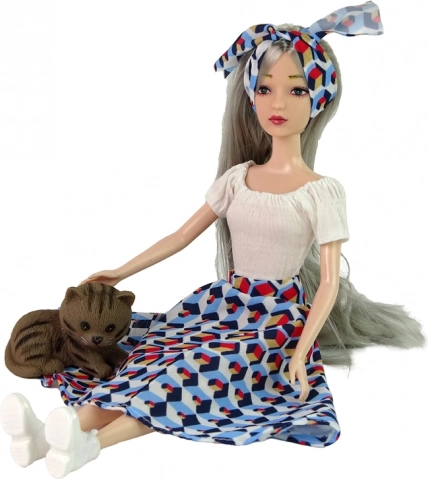 Открийте чара на куклата EMILY с дълги сиви коси, ясни сини очи и съчетана диадема. Тя носи бял топ и разкроена пола с геометричен десен, допълнени от бели обувки. В комплекта има сладко котенце и бяла люлка – идеални за въображаеми сценки и грижа за любимеца.