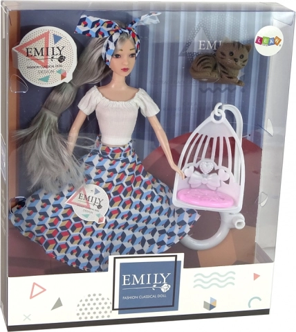 Очарователната кукла EMILY ще зарадва всяко дете със своите дълги сиви коси, стилен тоалет и мил аксесоар – котенце и люлка. Страхотна за креативни и модни игри, насърчава фантазията и фината моторика. Подходяща за деца от 3 години, с CE сертификат и съответствие с EN71.