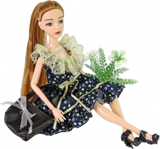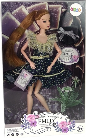 Открийте света на модата с куклата EMILY – идеален избор за креативни игри, домашни модни ревюта и ежедневни истории. Куклата е облечена в красива тъмносиня рокля с бели цветчета и съчетаващи се черни обувки на ток. Дългата коса приканва към разресване и създаване на прически, а подвижните крайници позволяват естествени пози като на истински подиум.