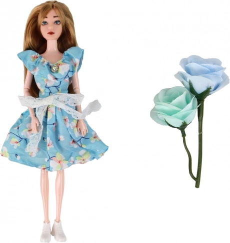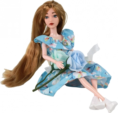 Куклата Емили (30 × 7 × 4 cm) е идеалният спътник за ежедневни игри. Дългата коса в нюанс тъмноруса се разресва и украсява лесно, така че децата могат да създават безброй прически. Синята рокля с флорален десен е украсена с дантелена панделка и малък „диамантен“ детайл при деколтето, който придава елегантна визия.