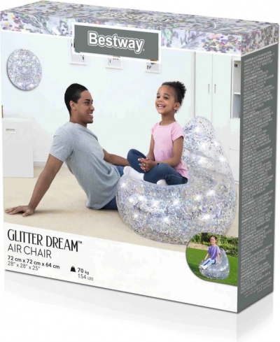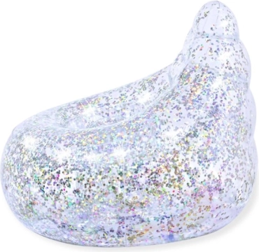 Надуваемият фотьойл се отличава с прозрачен пластмасов материал, изпълнен с цветен брокат, който блести при всяко движение и придава шик на вашето пространство.