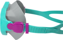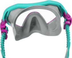 Маската предлага широк изглед благодарение на поликарбонатните лещи с UV защита, мекото силиконово уплътнение прилепва отлично към лицето, а регулируемата каишка осигурява стабилност. Шнорхелът с ергономичен силиконов мундщук е оборудван с издишващ клапан и вълнолом срещу навлизане на вода. Плавниците с регулируема каишка в размер 37–41 подпомагат ефективния замах и лесното движение във водата.