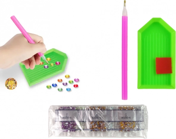 Комплектът включва тавичка за кристали, писалка и лепило за прецизно и лесно поставяне на кристалите.
