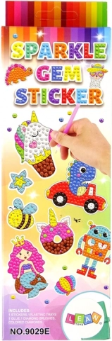 Комплектът съдържа всичко необходимо за създаване на блестящи стикери, които ще зарадват всеки любител на творчеството. Тази креативна дейност развива търпение, точност и мануални умения. Всеки стикер има повърхност с лепилен слой и маркировки за цвета на диамантчетата, които трябва да се поставят. Създайте малко произведение на изкуството, залепяйки камъче по камъче! Стикерите изобразяват космически ракети, летящи чинии, астронавти в образи на животни и малки планети.
