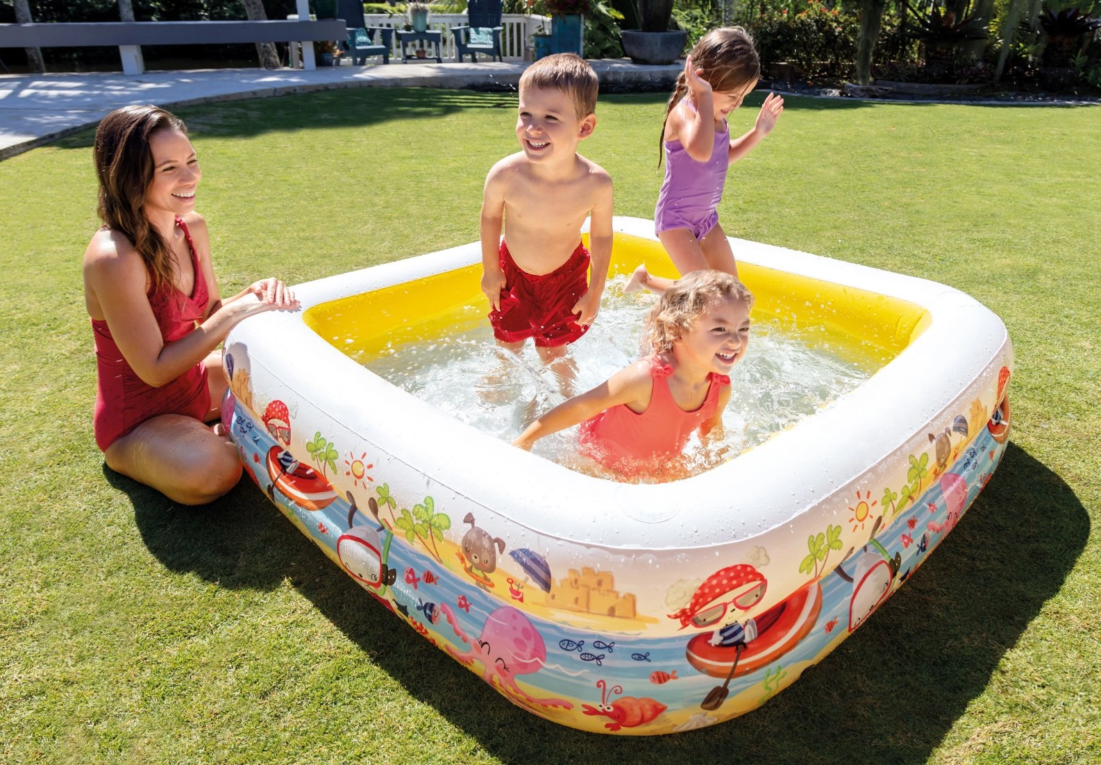 Насладете се на лятото в градината с удобно и безопасно къпане за най-малките. Този детски басейн INTEX предлага подвижен навес за сянка, издръжлива винилова изработка и практичен изпускателен вентил. Благодарение на живите цветове и веселите картинки децата ще заобичат къпането.
