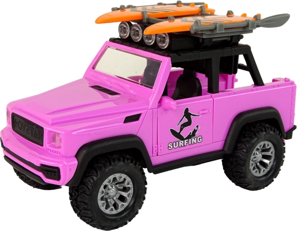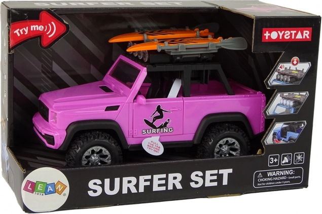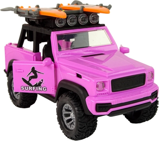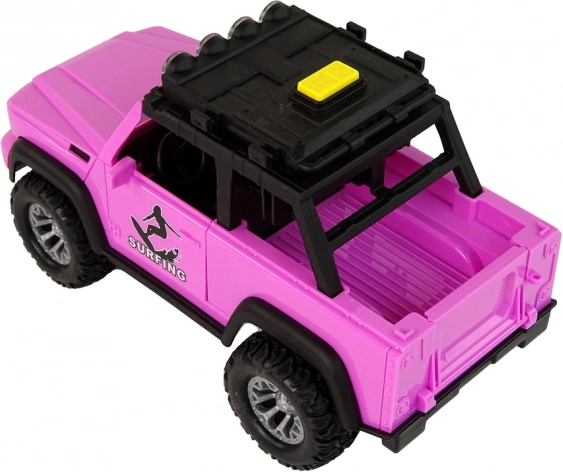 Насладете се на лятното настроение с розов офроуд автомобил на тема сърф. Реалистичните детайли, големите колела и инерционното задвижване осигуряват плавно каране, а светлините и звуците превръщат всяко пътуване в приключение. Сърф дъските и греблата на покривния багажник стимулират фантазията и насърчават плажните истории.