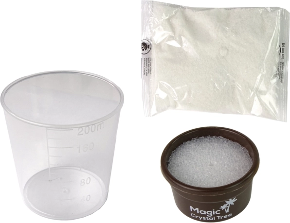 Мерителна чашка, кристален прах и основа за дърво позволяват безопасно и удобно да проведете целия експеримент у дома.