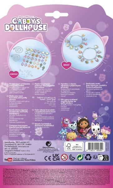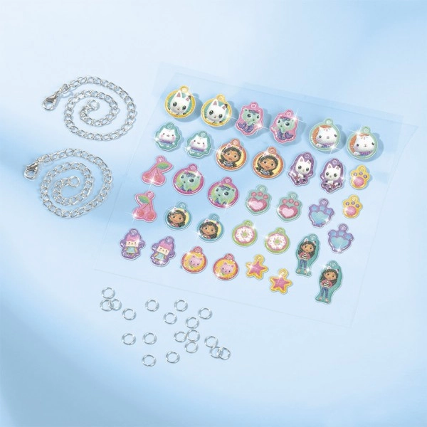 Този креативен комплект е идеален за малки творци и фенове на Габи и нейния куклен дом. Децата могат да изработят ръчно любими гривни с висулки, които да запазят за спомен.