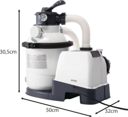 Пясъчната филтрация INTEX е идеален избор за средни и големи надземни басейни. Високият дебит 5700 l/h и системата Hydro Aeration значително подобряват циркулацията и обогатяването на водата с кислород, което се отразява на нейната прозрачност и комфорта при къпане. Здравата антикорозионна конструкция на резервоара, ясният манометър и въртящата се пръстенова връзка улесняват монтажа и поддръжката.
