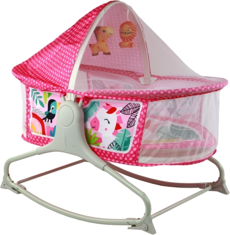Мултифункционалното бебешко легълце с люлка 2в1 предлага не само комфортно място за спане, но и подложка и люлка в едно. Розовият цвят създава приятелска среда за децата, а мрежата и сенникът предпазват детето от насекоми и слънце, което позволява спокоен сън на свеж въздух. Възможността люлката да се превърне в стабилно легълце чрез разгъване на крачетата осигурява допълнителна гъвкавост.