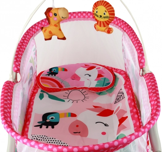 Това розово легълце с мотиви на весели животни осигурява безопасно и успокояващо място за почивка.