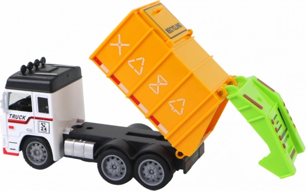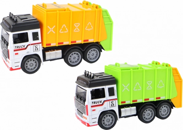 Реалистичният сметосъбиращ камион с ремарке ще зарадва малките шофьори. Предлага фрикционно задвижване, отваряемо ремарке и горен отвор за пускане на „отпадъци“, изработен е от издръжлива пластмаса и е наличен в 2 цвята. Компактни размери 13 × 7 × 5 cm, безопасен благодарение на сертификати CE и EN71 за деца от 3 години.