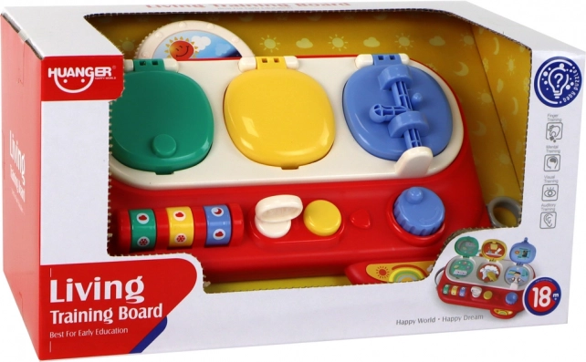 Цветни бутони, копчета и въртящи се елементи подпомагат развитието на координацията око–ръка и сензорното възприятие. Идеално за първи стъпки в ученето чрез игра.