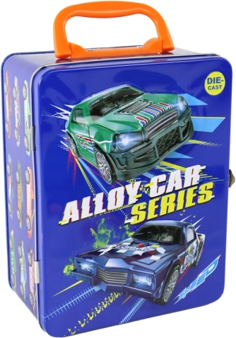 В комплекта е включено стилно метално куфарче с мотив на спортни автомобили, метално закопчаване и сгъваема дръжка. Вътре ще намерите подредени отделения за безопасно съхранение на количките – перфектно за малки колекционери както за път, така и за детската стая.
