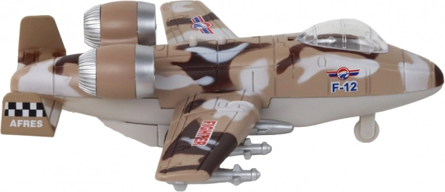 Военният изтребител Camo е страхотна играчка, която ще впечатли всеки малък изследовател. Благодарение на светлинните и звуковите ефекти играта е по-автентична и подпомага развитието на моторните способности. Например при бързо движение позволява на децата да симулират различни сценарии и действия, свързани с военни самолети. Предлага се в три цветови варианта: синьо-сиво, сиво и бежово-кафяво. Играчката е предназначена за деца от 3 години и отговаря на CE сертификат и стандарт EN71.