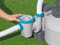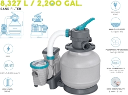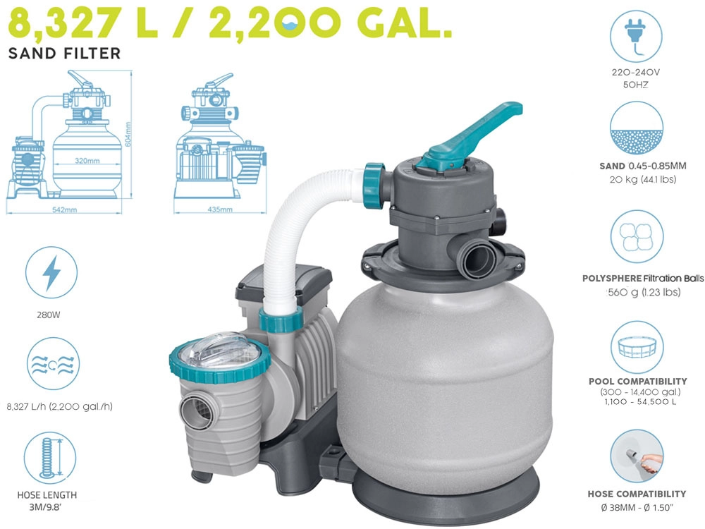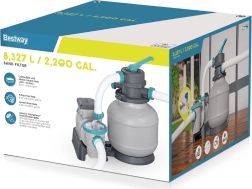 Пясъчната филтрация BESTWAY с капацитет 8327 l/h осигурява многостепенно пречистване на водата и значително намалява нуждата от поддръжка на басейна. Благодарение на здравия, антикорозионен резервоар и горен капак, въртящ се на 360°, свързването на маркучи е бързо и удобно от всяка страна. Подходяща за семейни надземни басейни, където е необходима надеждна филтрация и висок дебит.