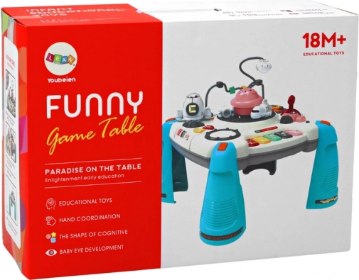 Масичката е оборудвана със сваляеми крака, което позволява използване директно на пода, и включва звукови елементи за развитие на музикалните интереси. Тази образователна масичка е идеално решение за деца от 18 месеца.