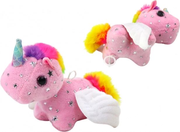 Очарователният розов еднорог от мек плюш ще зарадва всяко дете. След навиване на връвчицата весело подскача и върти опашката. Има нежна розова козина със сребърни звездички и бели крилца. Идеален спътник за фантазийни игри и развитие на уменията. Скачащо движение, мек плюш, магически вид, подпомага въображението и моториката.