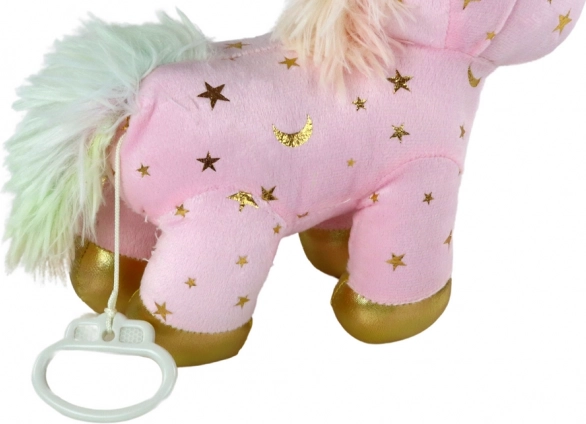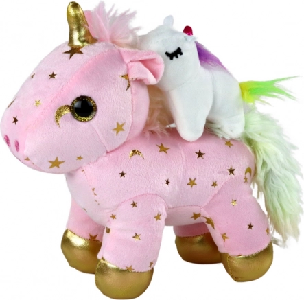 Нежна розова материя със златни звездички и блестящи детайли превръщат еднорога в сладък спътник и красива декорация.