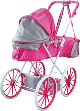 Стилна розова количка за кукли с здрава метална конструкция, идеална за ежедневна игра у дома и навън. Големите пянови колела осигуряват плавно движение по различни повърхности, сгъваемият сенник предпазва куклата, а практичната чанта и долната кошница предлагат достатъчно място за аксесоари. Отговаря на стандартите CE и EN71, подходяща за деца от 3 години.