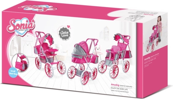 Количката е оборудвана със сгъваем сенник за защита на куклата от слънцето, чанта за аксесоари за всички дреболии и долна кошница за допълнителни играчки. Лека е, лесна за управление и безопасна, което я прави чудесен подарък за деца от 3 години.