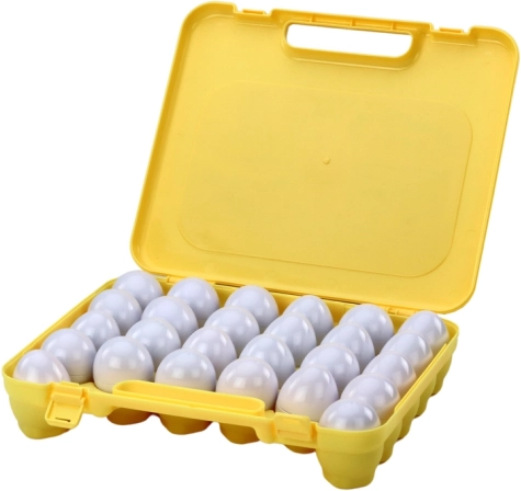 Жълтата куфарче-чантичка позволява лесно пренасяне на яйцата и ги предпазва от повреда. Благодарение на това свойство играчката е идеална за пътуване.