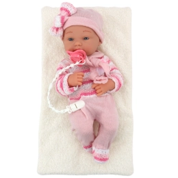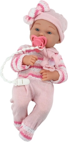 Очарователната бебе кукла в розово облекло ще зарадва всяка малка грижовница. Предлага подвижни ръце и крака, реалистични черти на лицето и практични аксесоари, включително биберон на връв и мека завивка. Изработена от безопасни материали, подходяща от 18 месеца.